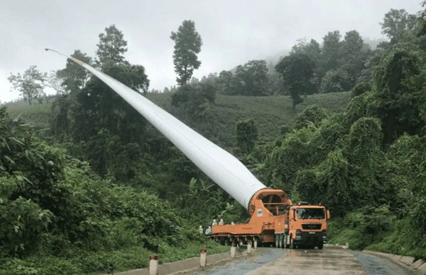 In 2020, we exported several sets of wind blade adapters to one of our customers in Vietnam. The wind blade adapter is mounted on a ten-axle hydraulic modular trailer; they can transport the windmill rotor blade over 70 meters ~80 meters in length and weigh up to 20 tons ~30 tons. The wind blade can be lifted to a 60-degree angle or rotated endlessly around its axis and the trailer at a 365-degree angle. With these advantages, the wind blade can easily be transported to handle difficult terrain, such as mountainous areas with many electric lines and obstacles like buildings, trees, electric lines, and sharp bends.